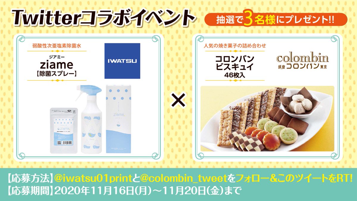 「Ziame 除菌消臭スプレー」と「コロンバンビスキュイ46枚入」を抽選で3名様に #プレゼント !20日(金)締切です。