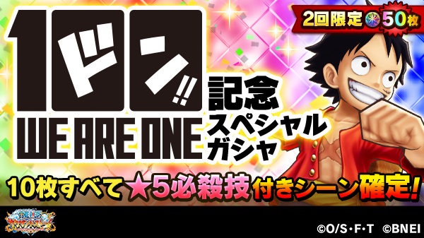★5必殺技付きシーンカード10枚確定の「ONE PIECE 100巻記念スペシャルガシャ」が登場!