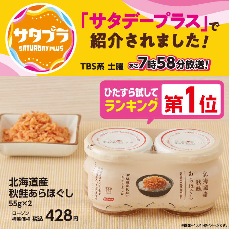 「北海道産秋鮭あらほぐし」が、TBS系 土曜7:58~「サタデープラス」ひたすら試してランキング「鮭フレーク」第1位で紹介されました♪お弁当にもぴったりです(^^)