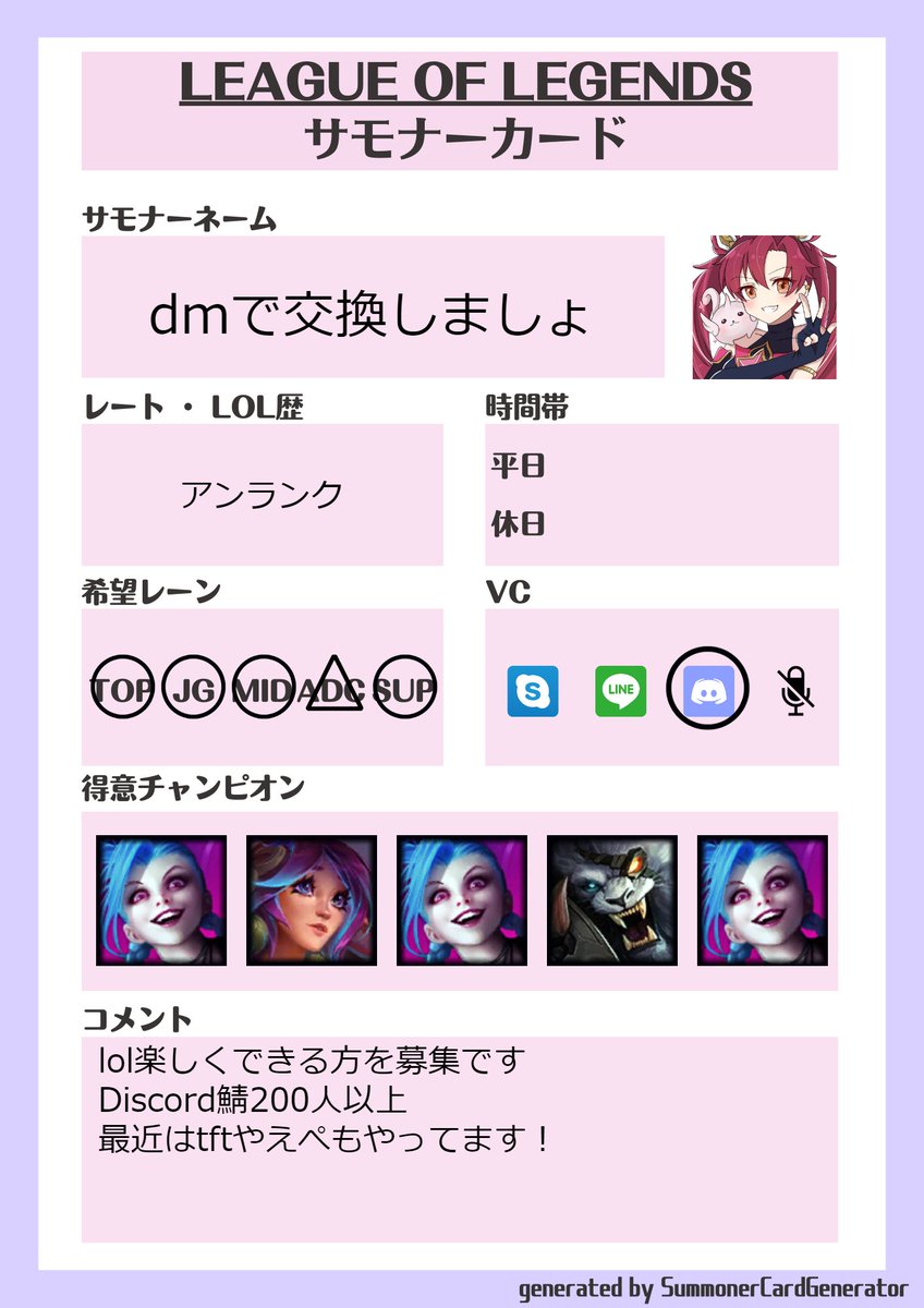 【LOL合コンサーバー】作りました! 彼氏彼女つくったり LOLのフルパ募集などにつかってください! 人が増えすぎたら締め切るので 早めに入っておいてください! ↓↓↓↓ discord.gg/mbqxW2qRS5 #VALORANT自己紹介カード #サモナーカード #LOL女子 #LOLフレンド募集 #lol初心者