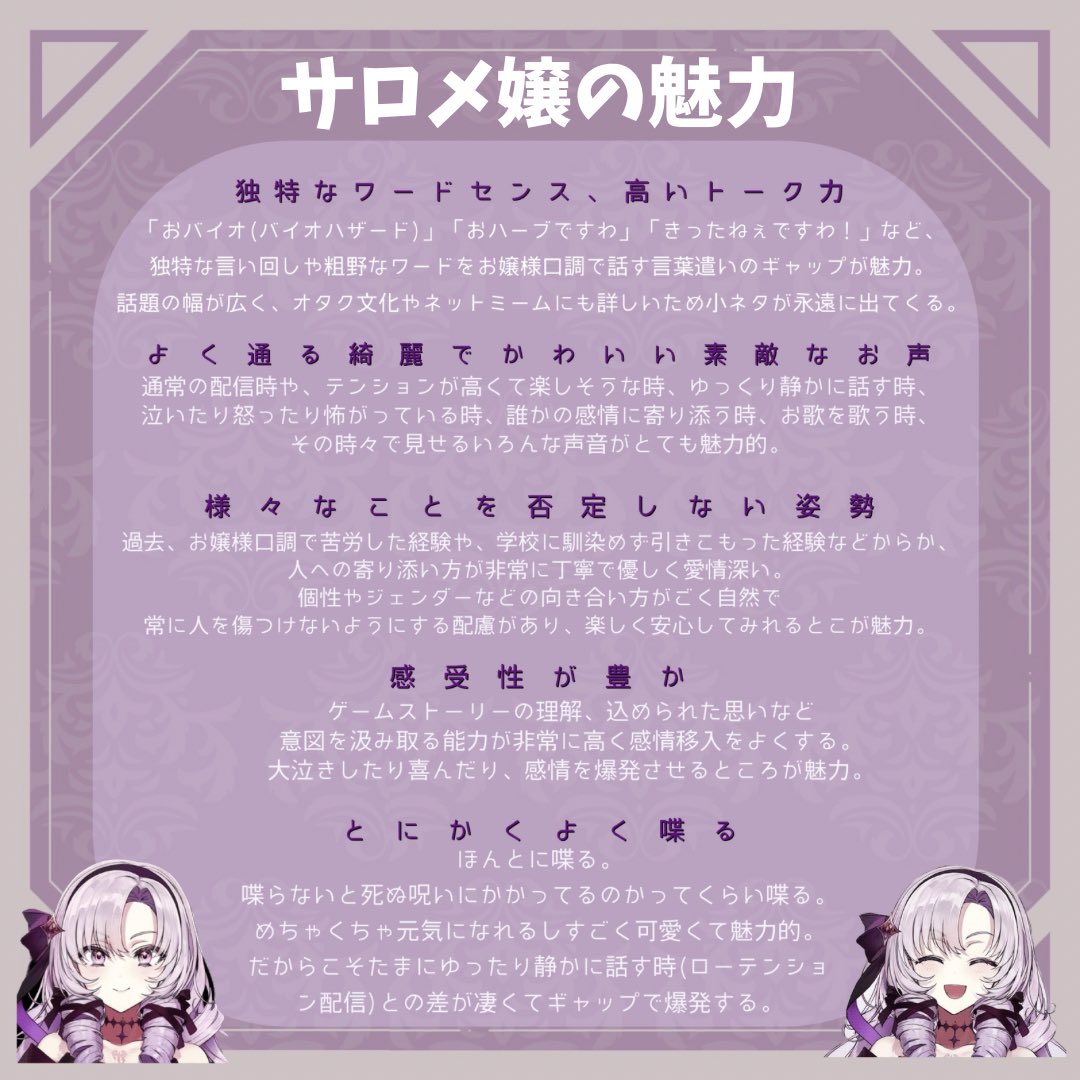 サロメ嬢のことを知らない人や名前は知ってるという方向けに、これを機にぜひ配信みてほしい❣️