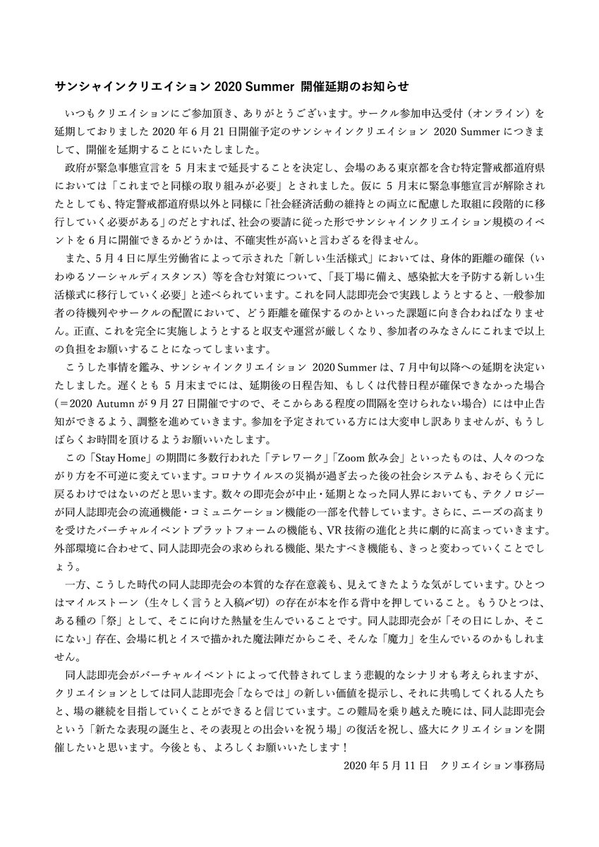 6月21日開催、サンシャインクリエイション2020 Summerの開催延期について、クリエイション事務局からのお知らせを掲載しました。