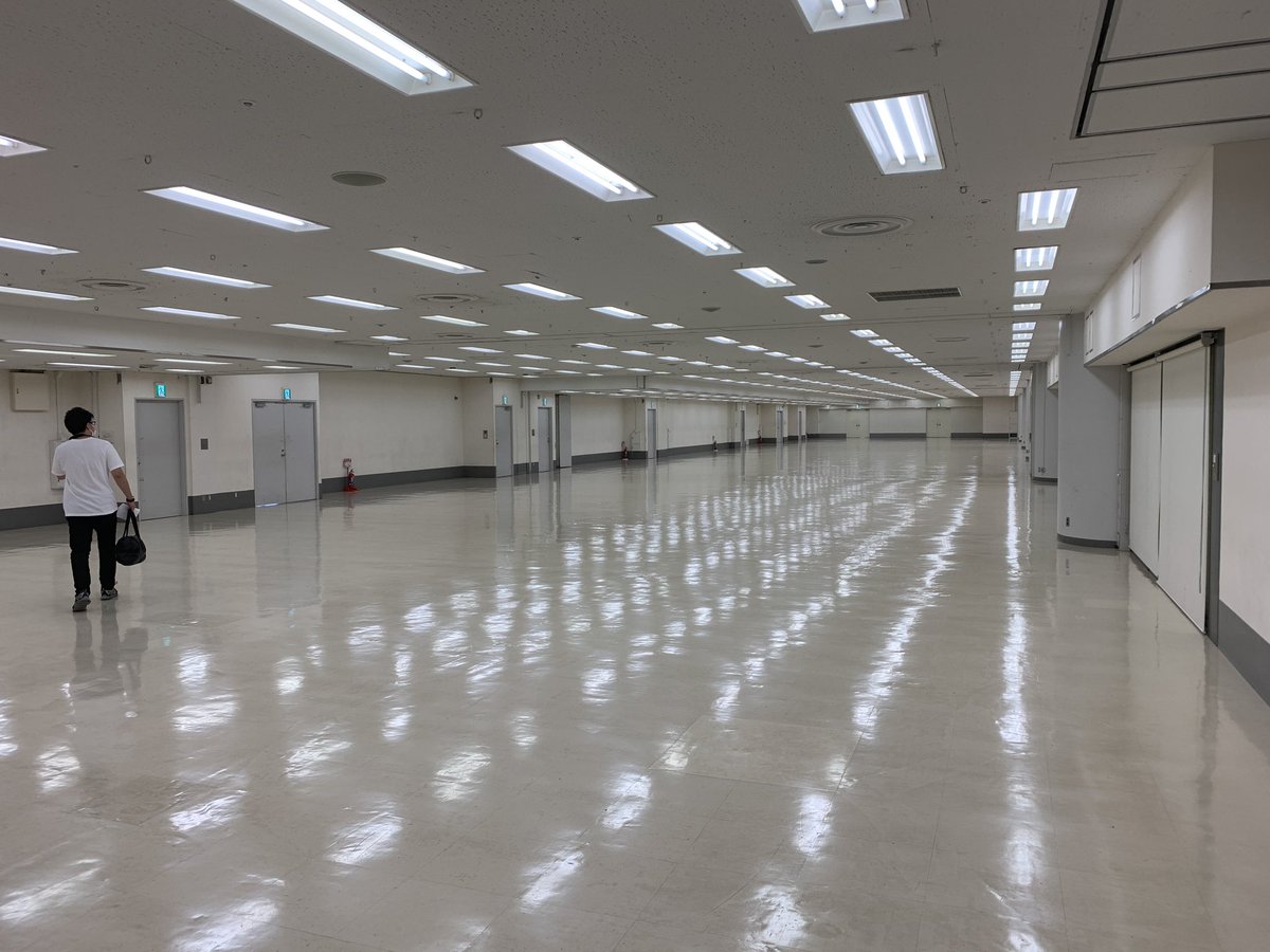 ホールのシャッターが開き、設営開始しています。たぶん10年ぶりの文化会館Dホール。ホールが長い! #サンクリ