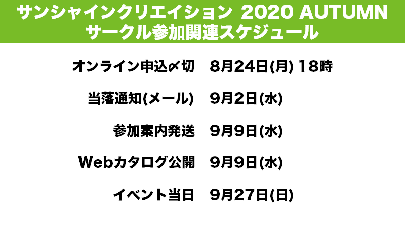 6月21日開催予定の「サンシャインクリエイション2020 Summer」につきまして、オンライン申込開始の延期と、申込〆切の延長を行います。