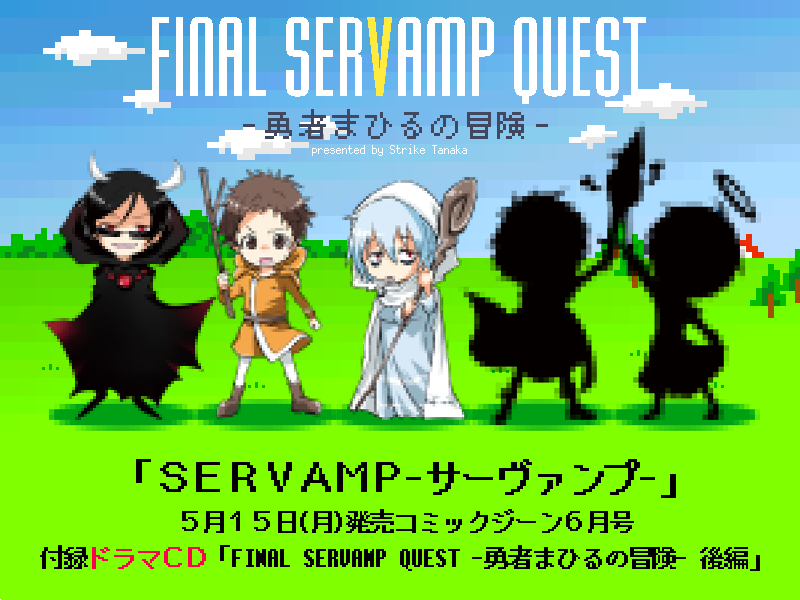 コミックジーン6月号、本日5/15発売!サーヴァンプはセンターカラーで第62話「僕がかわりに殴ってやろう」掲載です。付録は2号連続ドラマCD「FINAL SERVAMP QUEST -勇者まひるの冒険- 後編」!RPG風キャライラストも田中先生描き下ろしです! #サーヴァンプ