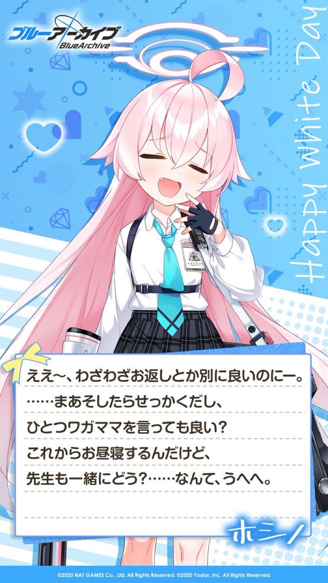 @Blue_ArchiveJPと# で生徒さんのお名前と #シャーレのハッピーホワイトデー をつけてツイートすると、生徒さんからお返事がくるようです!