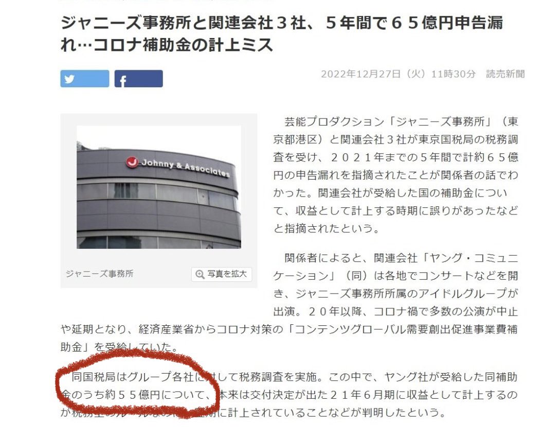 ねぇ、勘違いかもしれないけど、消された記事とアップされてる記事で気になる点があって、“国からの補助金55億円”っていう記述がなくなってる?。。。お年玉を記事のメインに持ってきて65億円の申告漏れはサラッと。1番報じられたくない部分って私「補助金」のところだと思ってる。