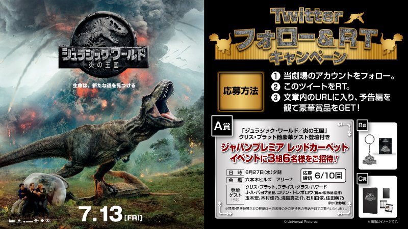 7/13(金)公開『#ジュラシック・ワールド/炎の王国』のジャパンプレミア・レッドカーペットイベントへ3組6名様をご招待!このツイートをRTして応募!※映画本編はご鑑賞できません。※本アカウントをフォローしてください。※会場までの交通費等はお客様のご負担となります。【6/17まで】