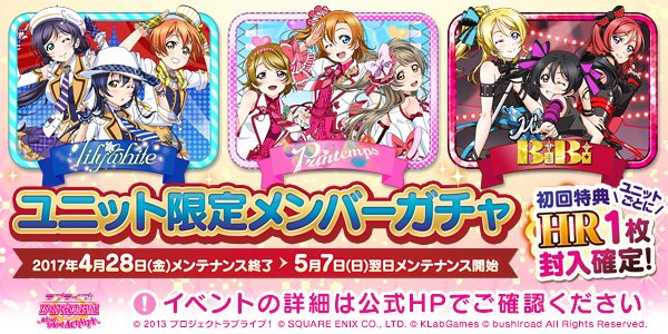 【4/28(金)~5/7(日)ユニット限定ガチャ】期間限定で各ユニットのメンバーのみが出現する限定ガチャを実施いたします!各ユニットガチャ「それぞれ」初回プレイ時にはHR出現確定!ぜひこの機会にゲットしてくださいね♪goo.gl/NqOcVX #スクフェスAC