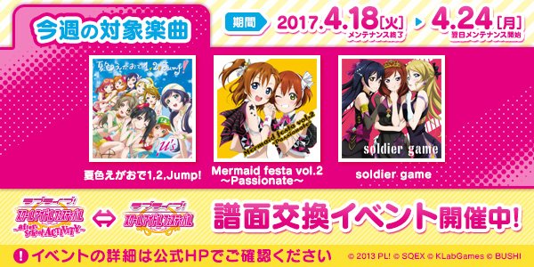【スクフェス譜面交換】プレイ可能なスクフェス譜面を更新!今週は「夏色えがおで1,2,Jump!」「Mermaid festa vol.2 ~Passionate~」「soldier game」の3曲です!詳細はこちらgoo.gl/9riU99 #スクフェスAC