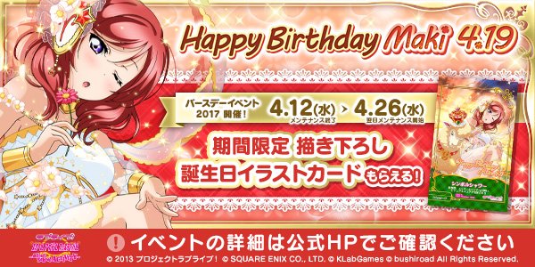 【イベント情報】4月12日(火)より「西木野真姫 バースデーイベント2017」を開催!真姫ちゃんを選択して対象楽曲をプレイするとバースデースキルカードやカードフレームがゲットできます♪詳細はこちらgoo.gl/tRXmTo #lovelive #スクフェスAC