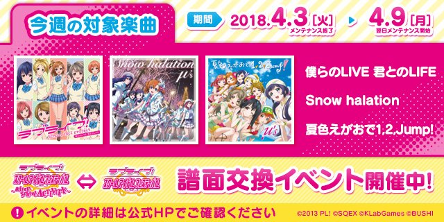 【訂正】本日から楽曲が更新となりましたスクフェス譜面交換イベントにつきまして、告知内容に誤りがございました。正しい内容は画像の通りとなります。訂正しお詫び申し上げます。#スクフェスAC