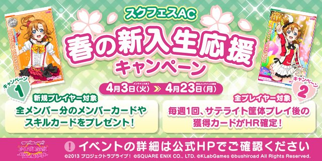 【キャンペーン情報】「スクフェスAC春の新入生キャンペーン」開催!新しくスクフェスACをはじめたプレイヤー全員に「新入生応援セット」をプレゼント!さらに全プレイヤーを対象にゲームプレイ後のリザルトで必ずHRが出現するキャンペーンを実施します!goo.gl/AB1Tmz #スクフェスAC