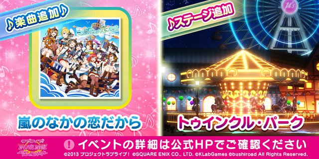 【新バージョン稼働開始!】4/3(火)にバージョンアップを実施しました!ダンス初公開となるスクフェスコラボシングル「嵐のなかの恋だから」新規ステージ「トゥインクル・パーク」を追加!ぜひプレイしてみてくださいね♪詳細はこちらgoo.gl/SZGMhY #lovelive #スクフェスAC