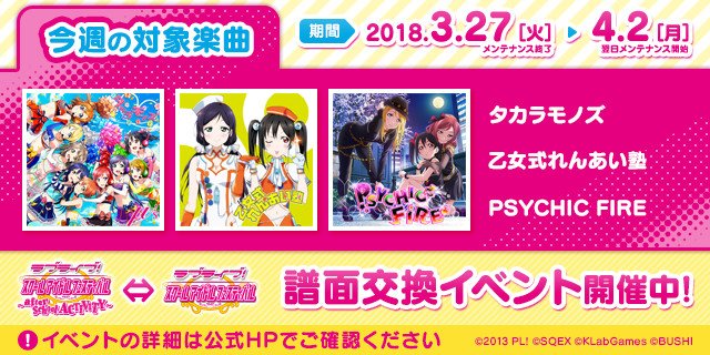 【スクフェス譜面交換】今週の対象楽曲が更新されました!「タカラモノズ」「乙女式れんあい塾」「PSYCHIC FIRE」の3曲がプレイできちゃいます♪詳細はこちらgoo.gl/Kh3TYS #lovelive #スクフェスAC