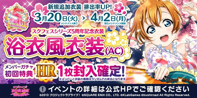 【新バージョン稼働中!】3/20(火)にバージョンアップを実施しました!新規衣装「浴衣風衣装(AC)」追加!ぜひプレイしてみてくださいね♪詳細はこちらgoo.gl/W1FnAH #lovelive #スクフェスAC