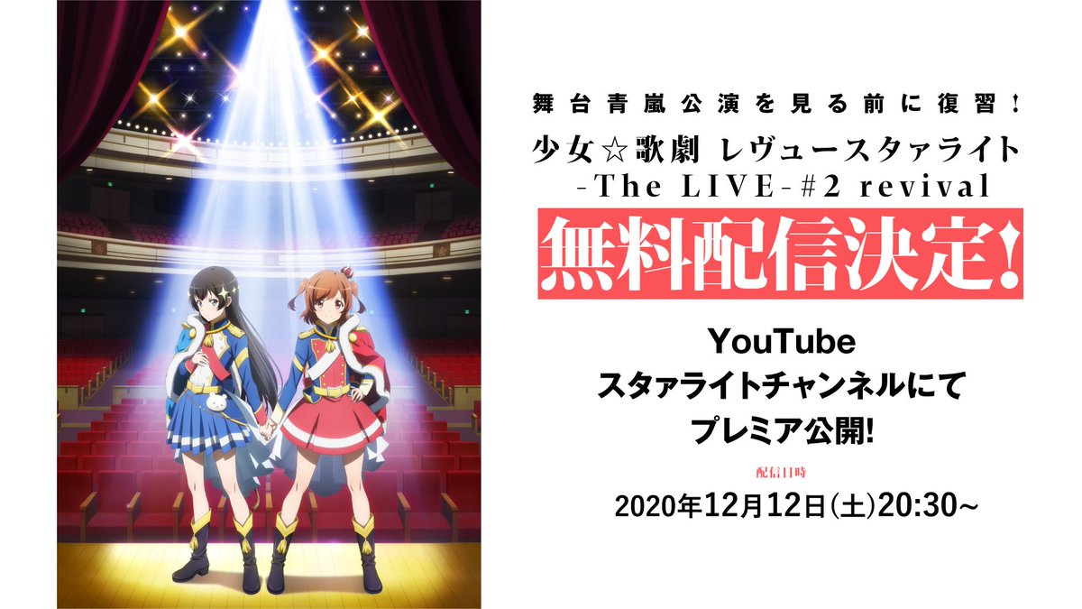 【舞台#2再演 無料配信🎊】 明日12/12(土)20:30~ 「少女☆歌劇 レヴュースタァライト -The LIVE-#2 revival」の無料配信が決定✨ YouTubeスタァライトチャンネルにてミュージカルパートをプレミア公開😍 青嵐を知らない方もこれを見れば丸わかり📢 revuestarlight.com/news/6977/ #スタァライト上映会