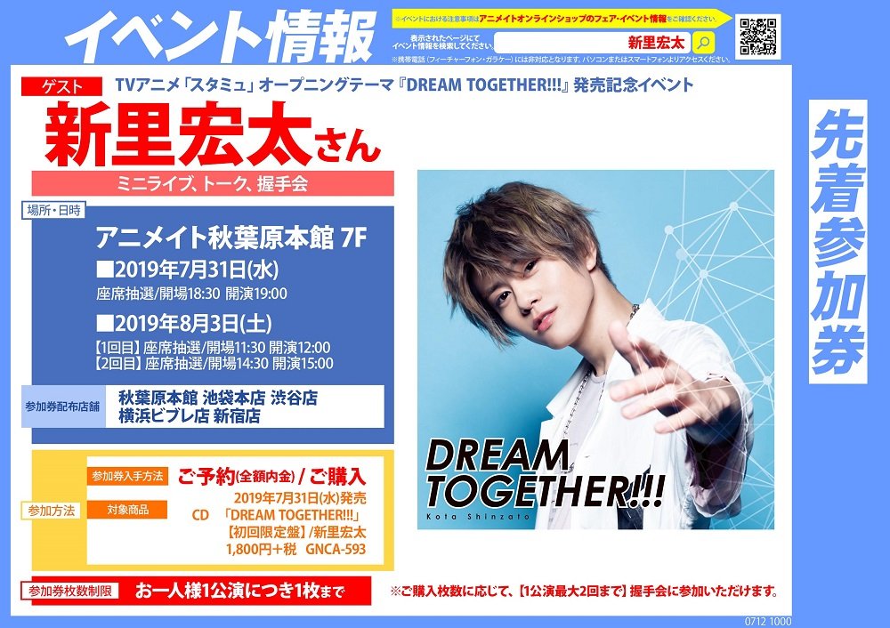第3期オープニングテーマ、新里宏太/『DREAM TOGETHER!!!』の発売記念イベントが決定致しました!