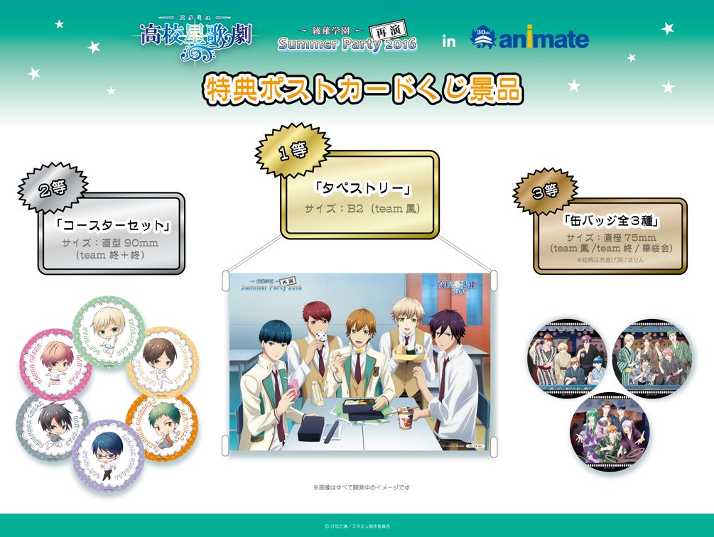 「SummerParty2016~再演~inアニメイト」9月8日(木)より全国アニメイトにて開催!特典ポストカード(くじ付き)ダブルチャンス景品も解禁♪フェア詳細はこちら hstar-mu.com/news/index0140… #スタミュ