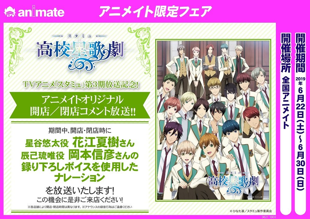 明日6月22日(土)~6月30日(日)までの間、全国アニメイトにて「スタミュ」オリジナル開店/閉店コメントが放送されます!どんな内容になっているのか、ぜひ最寄りのアニメイトにてチェックしてみてくださいね♪