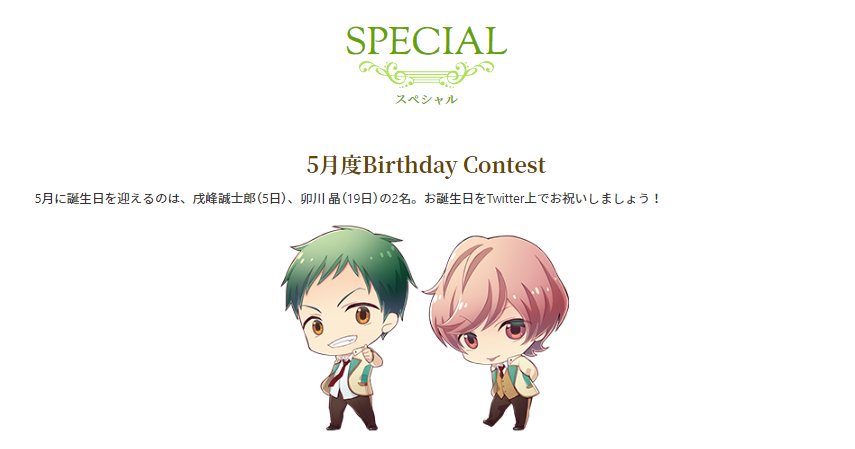 キャラクターの誕生日お祝い企画開催中!5月に誕生日を迎えるのは、戌峰誠士郎、卯川晶の2名♪バースデー装飾画像をツイートして誕生日をお祝いしよう!優秀者には直筆サイン色紙をプレゼント!当日のご参加お待ちしております★ hstar-mu.com/special/bc/ind… #スタミュ