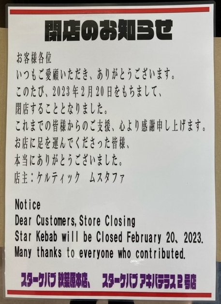 更新:“アキバ飯”の代名詞「スターケバブ」が復活!3月31日から1号店のみ営業を再開 akiba-pc.watch.impress.co.jp/docs/news/news… #スターケバブ