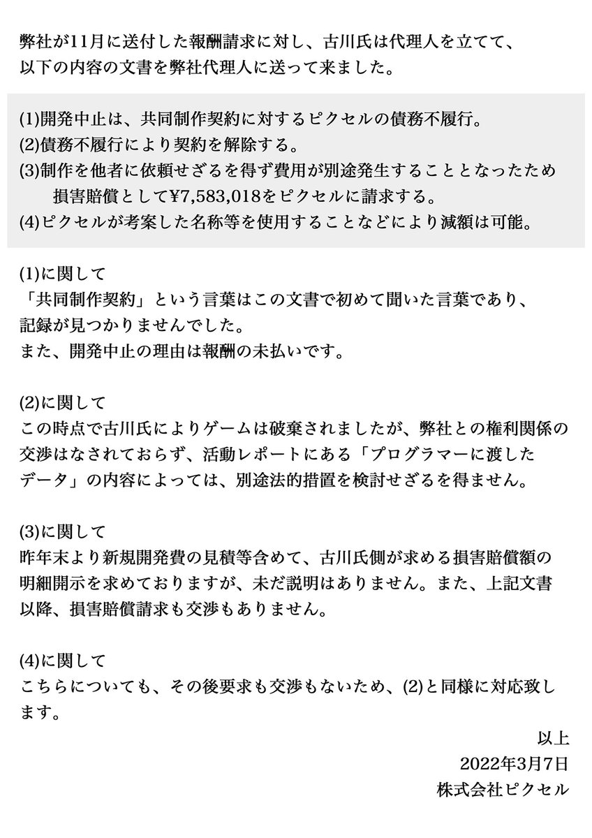 ピクセルの質問状に答える事なく、