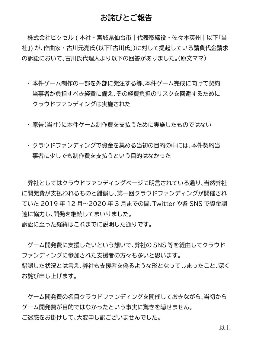 現在、佐々木氏、古川氏の裁判は「開発費不払い」に関する裁判です。
