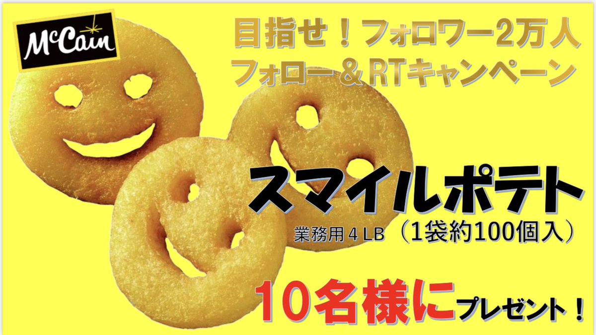 #プレゼントキャンペーン🎯第3弾 SNS映え抜群✨ 業務用『スマイルポテト4LB 』を抽選で10名様にプレゼント🎁 ▼応募は2ステップ 1️⃣@McCain_Foods_JPをフォロー 2️⃣このツイートをRT🔁 〆切は3/7迄 当選者の方にはDMで通知致します😊 #マッケイン #キャンペーン #懸賞 #プレゼント #スマイルポテト