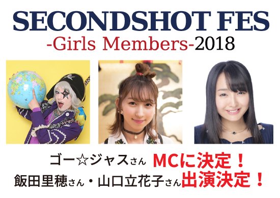 【発表】5月12日開催「SECONDSHOT FES -Girls Members- 2018」に、今年もゴー☆ジャスさんがMCとして出演決定! また、飯田里穂さん、山口立花子さんの出演も決定しました!