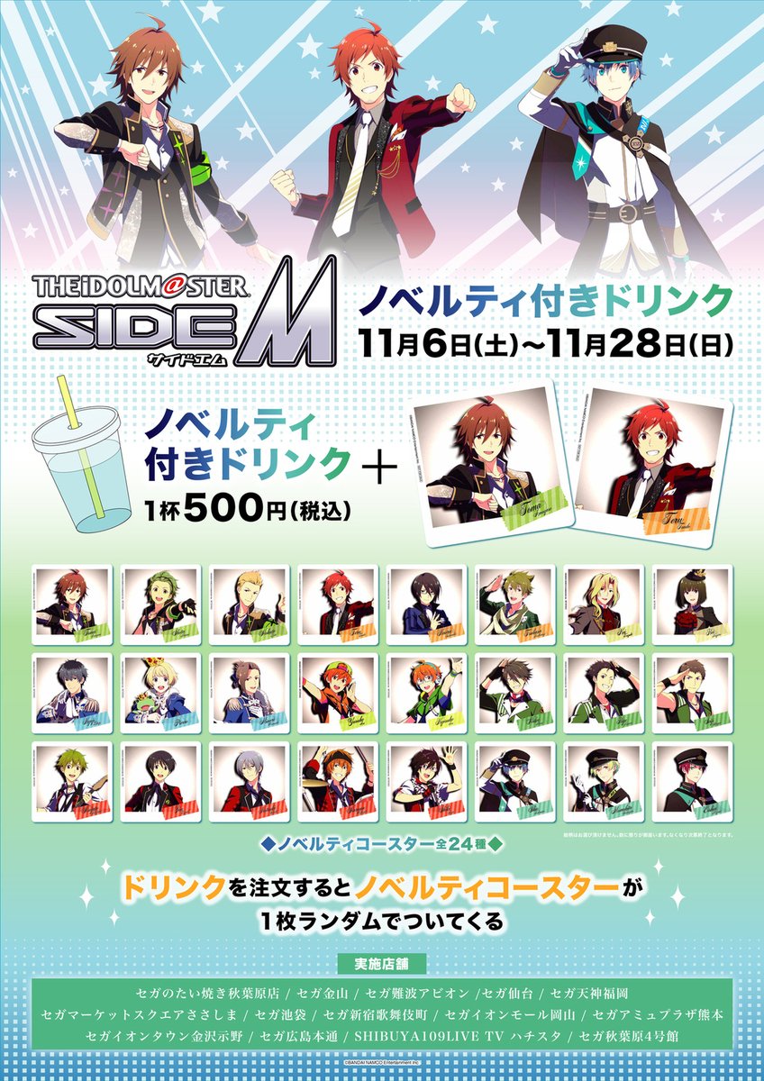この度、アイドルマスター #SideM 様とのコラボが決定✨ 11月6日よりSideM焼きの登場や全国13店舗にてノベルティ付きドリンクの販売も同時開催💕 コラボを記念して「コースターコンプセット」を抽選で3名様にプレゼント🎁 締切:11月5日まで tempo.gendasega.jp/sidem.html #SideM #サイスタ #セガのお店
