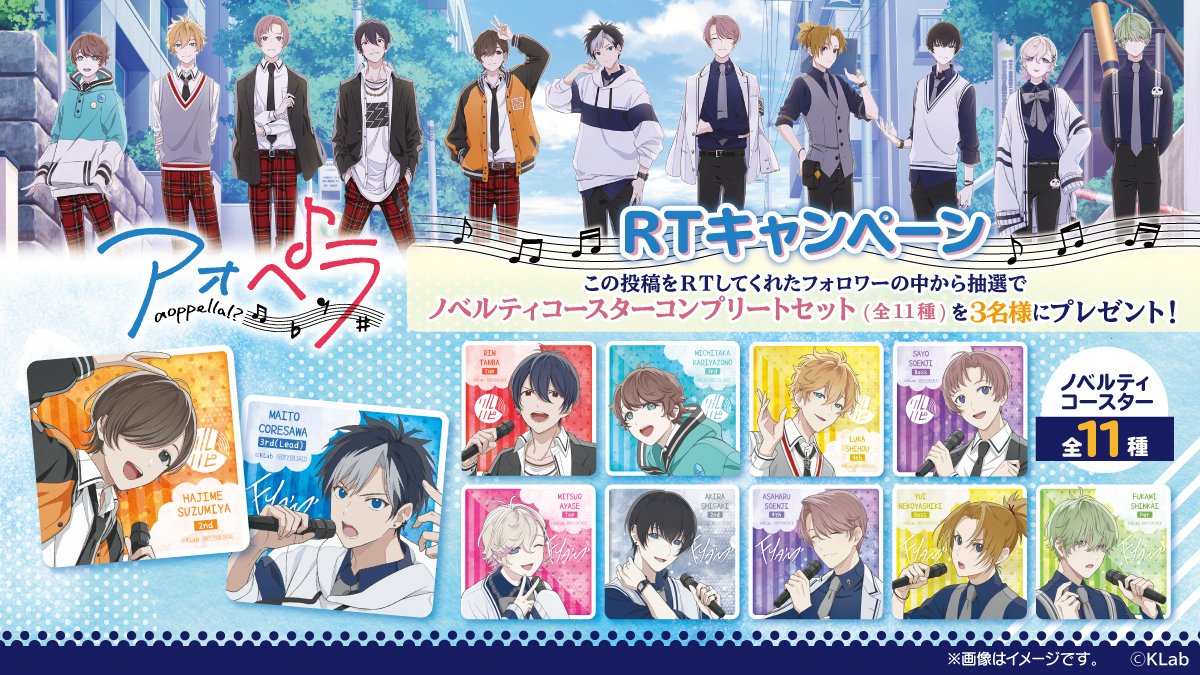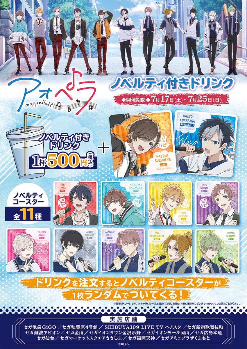 7月17日(土)より #セガのお店 で開催予定の『 #アオペラ ノベルティ付きドリンク』を記念して「ノベルティコースターコンプセット(全11種) 」を抽選で3名様にプレゼント!