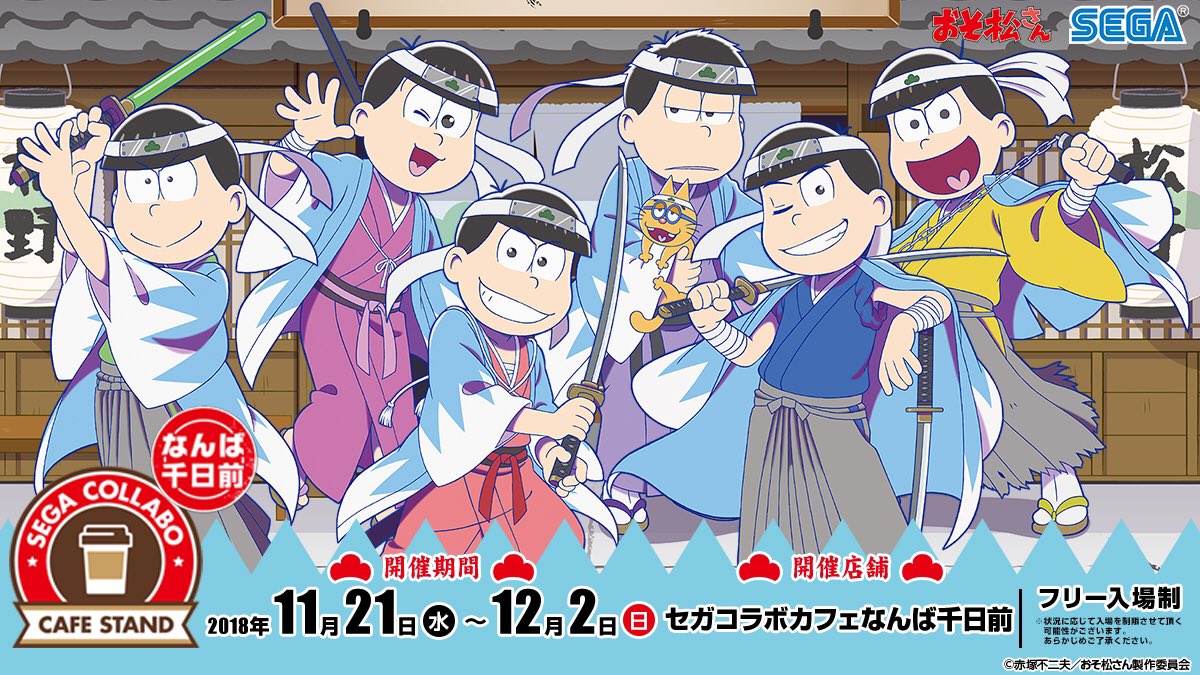 「セガコラボカフェスタンド なんば千日前」オープン決定! 2018年11月21日(水)から「セガコラボカフェスタンドなんば千日前 おそ松さん」開催✩ドリンクのテイクアウトや物販販売を実施♪ 詳細はこちら→goo.gl/xmC9F2 #おそ松さん #セガコラボカフェスタンド