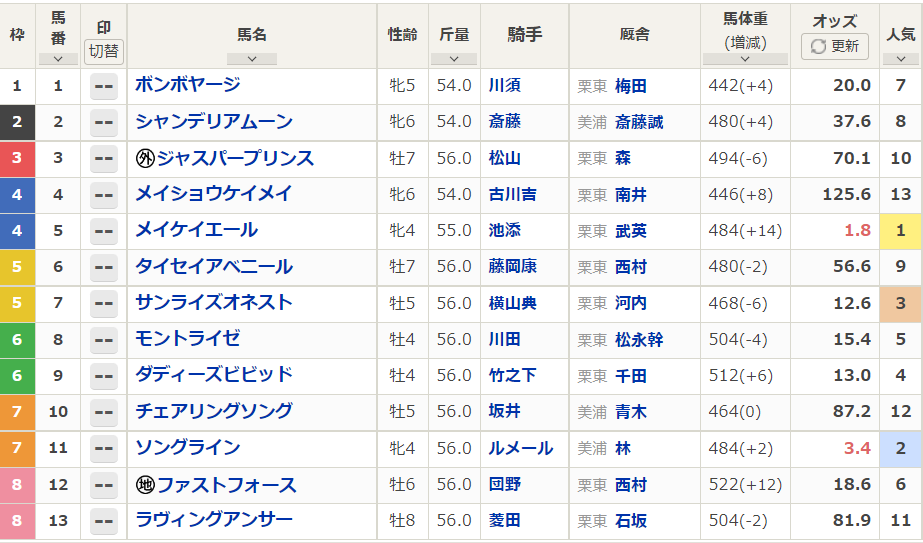 ソングラインが3.6倍で続き、3番人気サンライズオネストは12.3倍。やや1強にも寄った、2強オッズ。