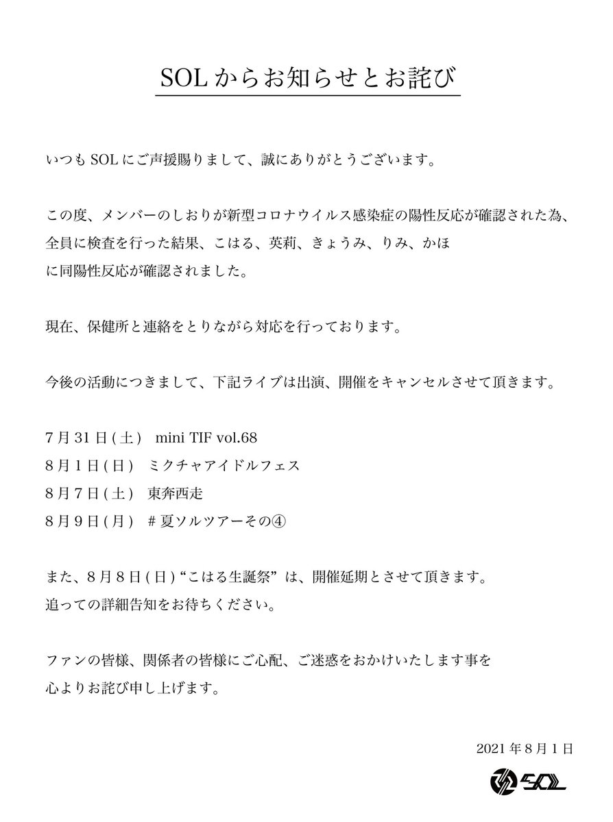 この度、メンバーに新型コロナウイルス感染症の陽性反応が確認されました。