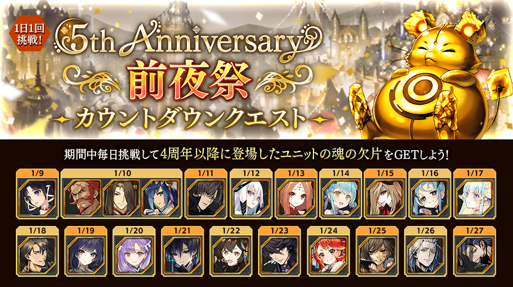 【キャンペーン】1/8(金) メンテナンス終了後より、5th Anniversary前夜祭キャンペーン第1弾開催!レリーフなどが登場する無料10連召喚や4周年以降に登場したユニットの魂の欠片を日替わりで獲得できるカウントダウンクエストが登場!詳細はこちら al.fg-games.co.jp/news/35516 #タガタメ