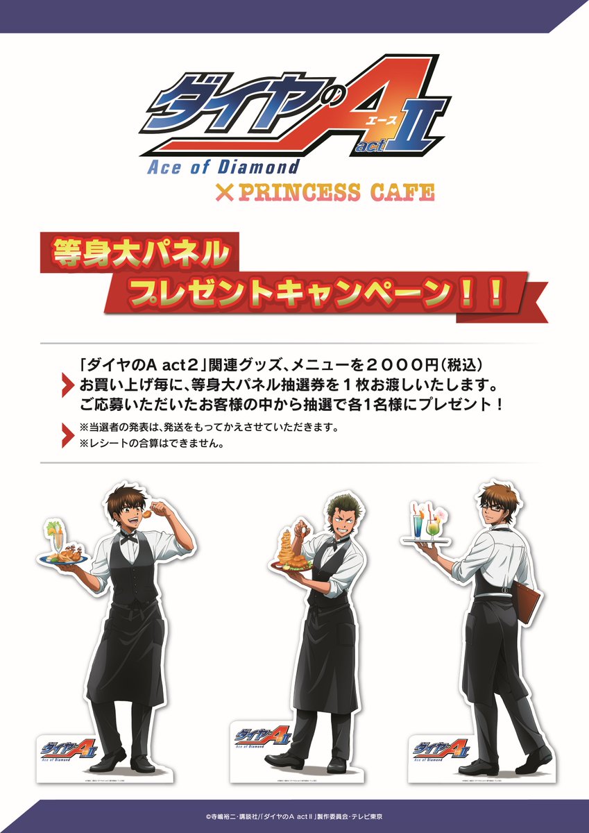 【ダイヤのA actⅡ✖プリンセスカフェ】 ■キャンペーンのご紹介です⚾️  ●ポストカードプレゼントキャンペーン  ●等身大パネルプレゼントキャンペーン  でございます! カフェ開催日まで1週間を切りました! お楽しみに! #ダイヤのAact#プリカフェ