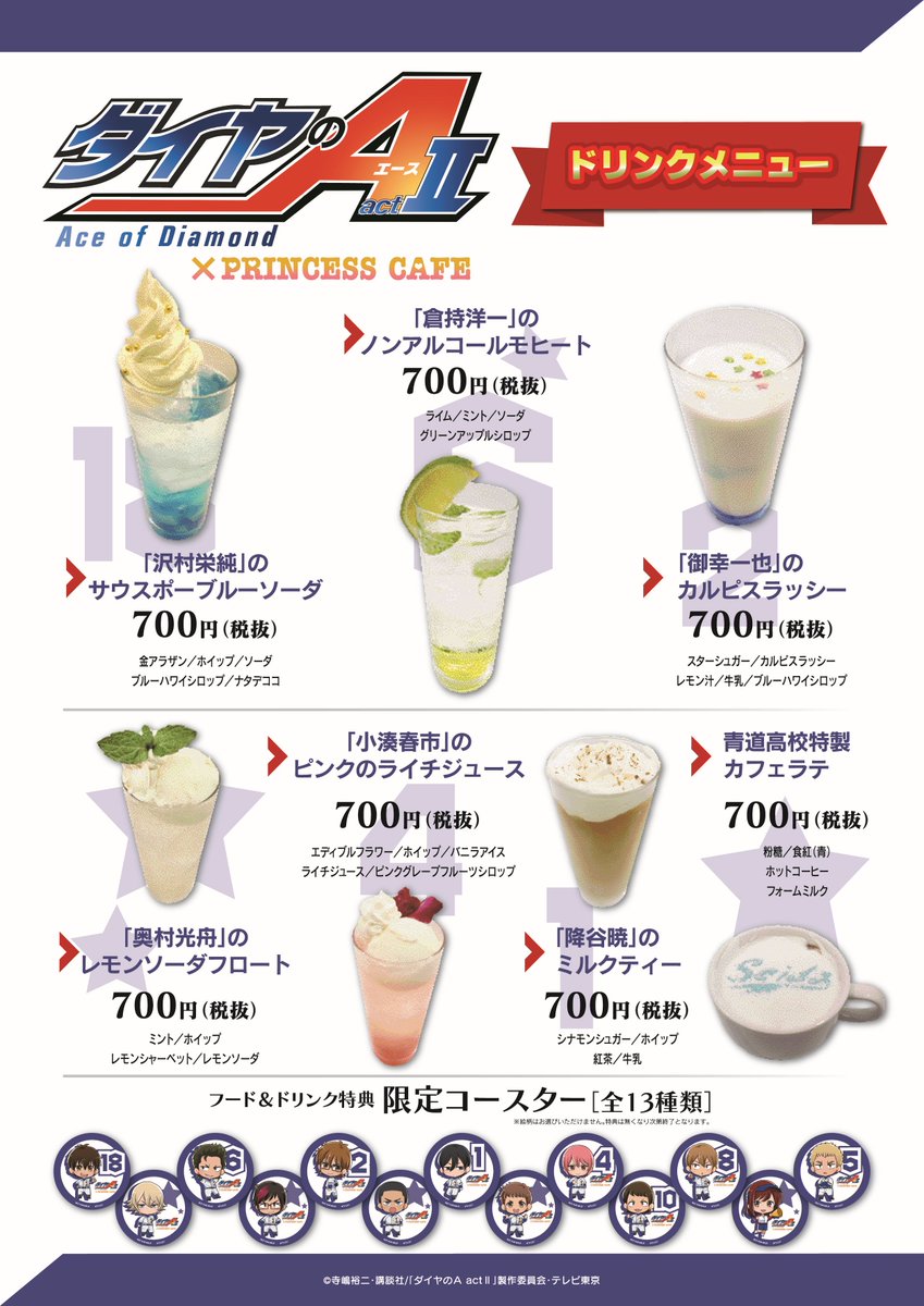【ダイヤのA actⅡ✖プリンセスカフェ】 お待たせ致しました! メニュー(ドリンク フード) 特典限定コースターのご紹介です! 皆様のご来店お待ちしております! #ダイヤのAact#プリカフェ