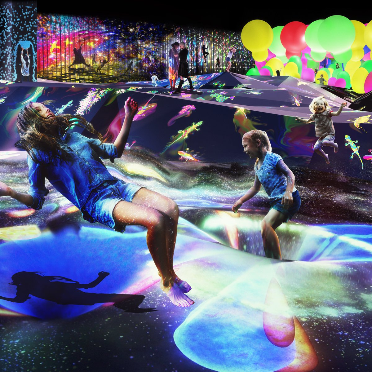 境界のないアートに身体ごと没入し、10,000㎡の複雑で立体的な世界を、さまよい、意思のある身体で探索し、他者と共に新しい世界を創り、発見していく。