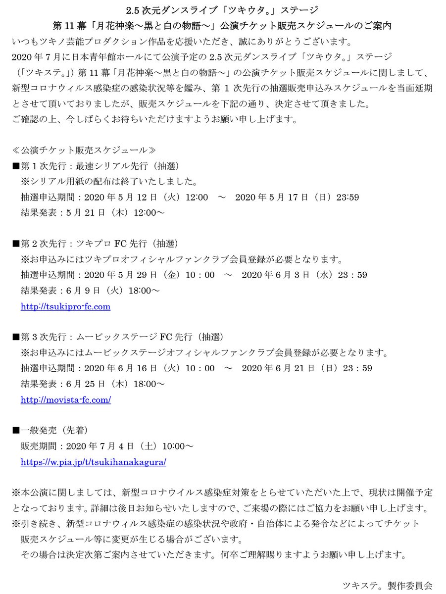 ■ツキステ11幕公演中止のお知らせ■