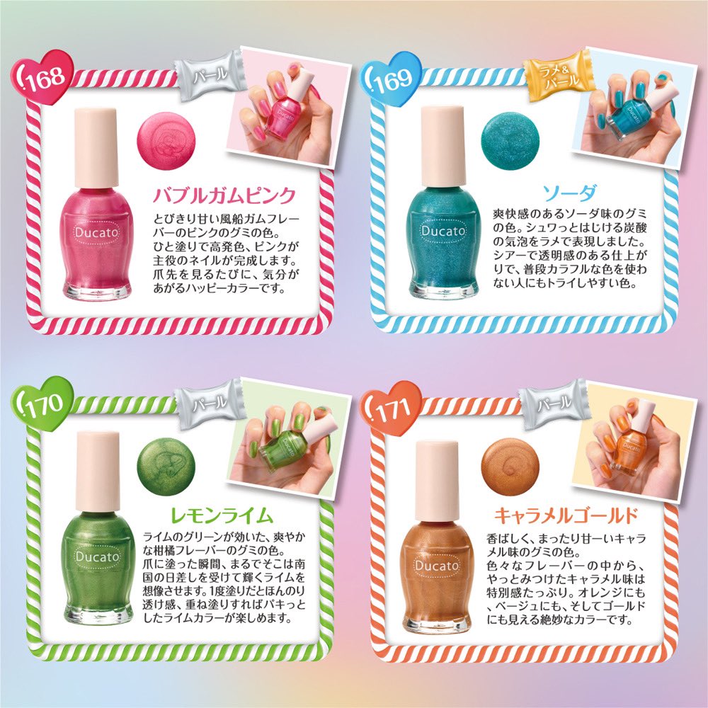 3月7日発売! ポップでカラフル★グミっぽ質感が楽しめる Favorite Gummy series グミのようなツヤやかな質感が楽しめます♪ 168 バブルガムピンク  169 ソーダ  170  レモンライム  171  キャラメルゴールド  デュカート ナチュラルネイルカラーN  4色 各¥660(税込) #デュカート