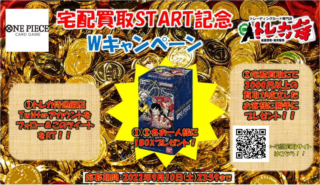 🔥重大ニュース🔥 トレカ侍通販店にて… ワンピースカード宅配買取スタートしました✨✨ スタートを記念してWキャンペーンを開催!! ①フォロー&RTで1名様に1BOXプレゼント🎁 ②宅配買取利用でも1名様に1BOXプレゼント🎁 torezamukaitori.com #トレカ侍宅配買取 #ワンピカード #ONEPIECE