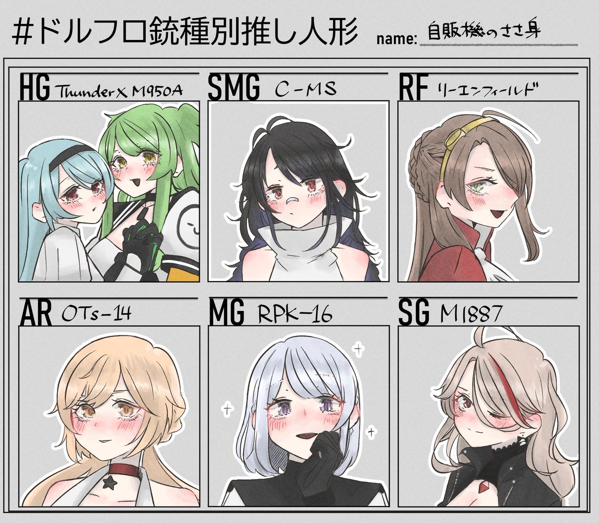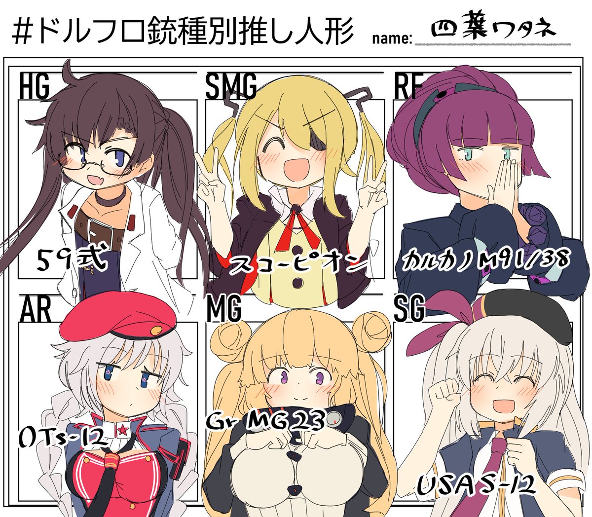 れっどくーろん(@redkowl00n2)さんのテンプレートをお借りしました。 全員好きなキャラだと描くのめっちゃ楽しい! #ドルフロ銃種別推し人形 #ドルフロ #少女前線