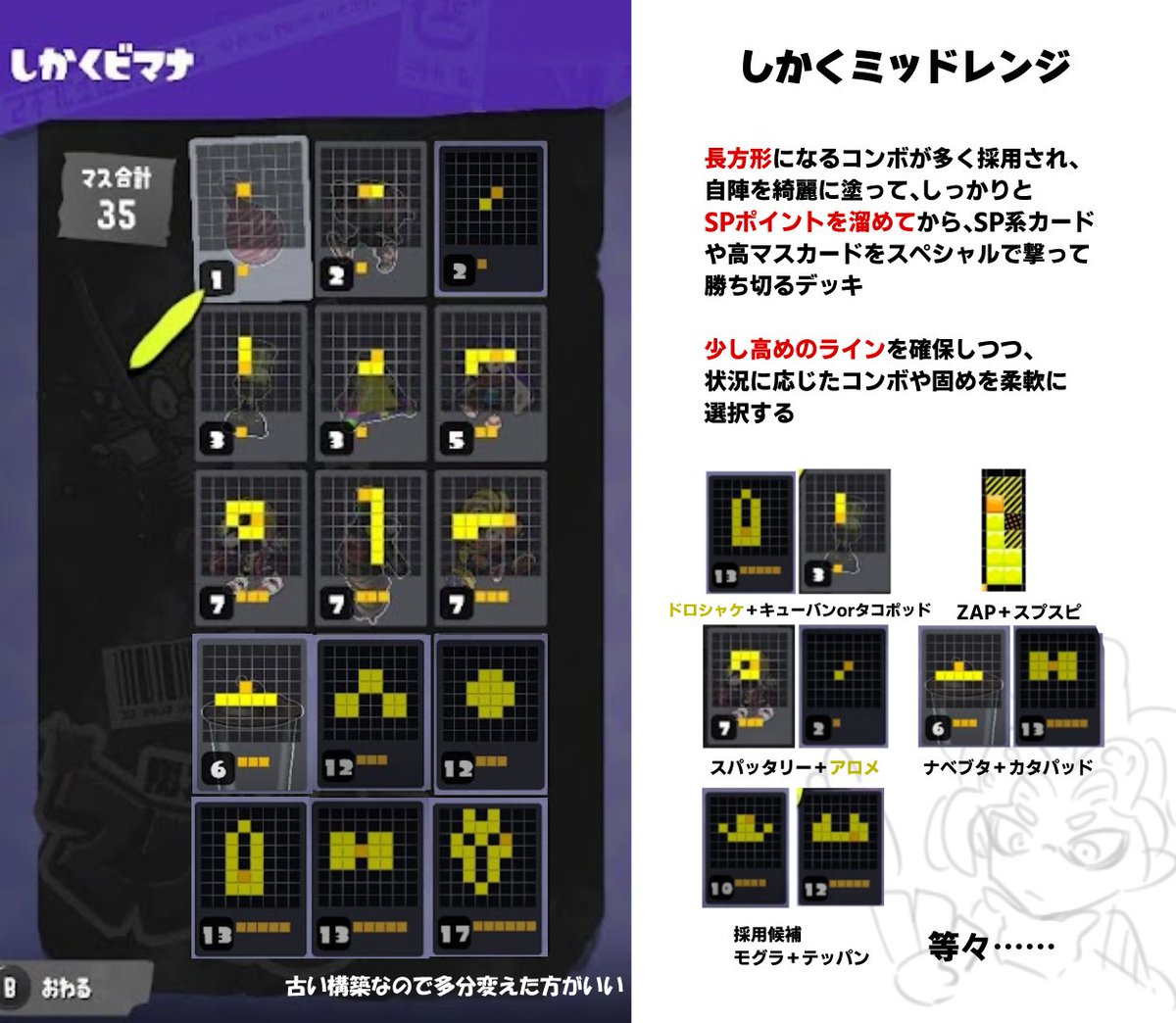 ナワバトラーで現在使っているデッキです! 横並びで3枚ごとに役割を区切って説明しました。 デッキ構築の参考になれば嬉しいです💁‍♂️ #スプラトゥーン3 #ナワバトラー