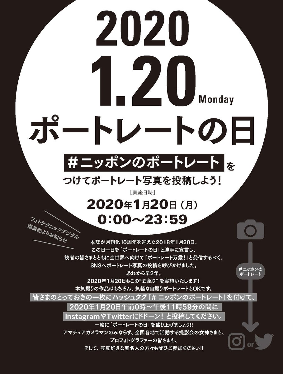 【拡散希望】フォトテクニックデジタルよりお願い! 小誌創刊記念の1月20日0:00~23:59に、ハッシュタグ「#ニッポンのポートレート」を添えて、twitterやInstagramにあなたのとっておきのポートレート写真をドドっとアップして下さい! 自撮りもOK! 「ポートレート万歳!」を世界に発信しよう!