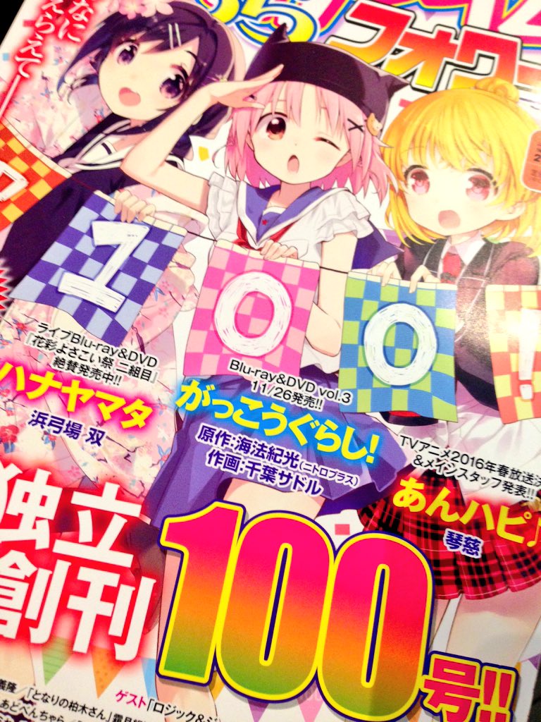 【100号記念★まんがタイムきららフォワード 1月号発売中デス٩(๑>◡<๑)۶】創刊100号は「がっこうぐらし!」さんや「あんハピ♪」さんとのスペシャルコラボ表紙デスよ( ´ ▽ ` )ノぜひお買い逃しなくデスね★ #ハナヤマタ