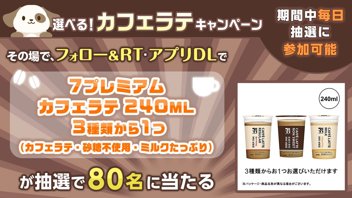 7プレミアム カフェラテ 240ML 3種類から1つ(カフェラテ・砂糖不使用・ミルクたっぷり)が抽選で80名様に🎊