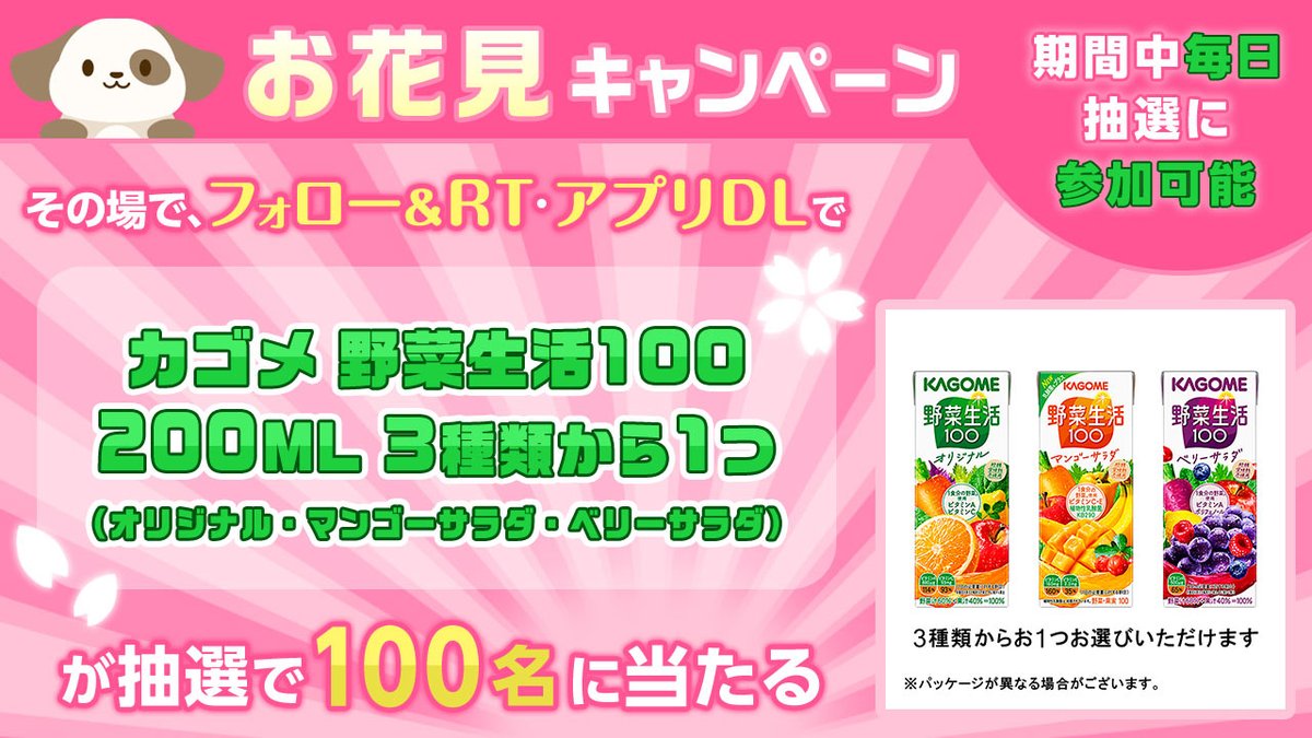 カゴメ 野菜生活100 200ML 3種類から1つ(オリジナル・マンゴーサラダ・ベリーサラダ )が抽選で100名様に当たる🌸