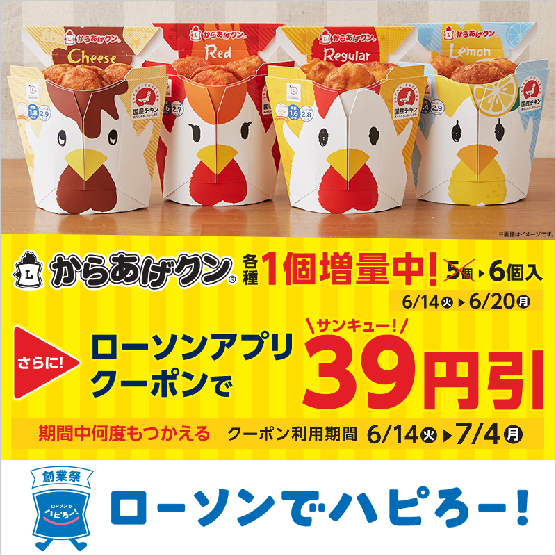 【創業祭アプリクーポン】からあげクンのおトクなクーポン配信予定です♪6/14も、ローソンアプリをチェック(^^)