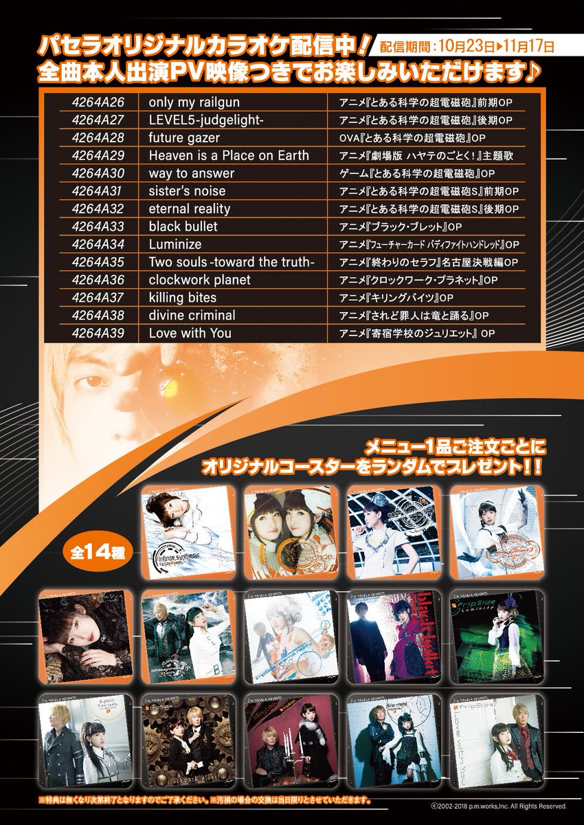 本人監修コラボメニューの他、fripSideの楽曲14曲のPV映像付きカラオケもお楽しみいただけます!